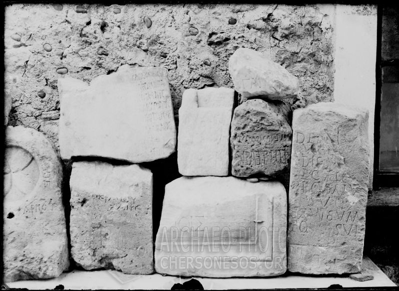 Photo "Fragments of different inscriptions and gravestones in the museum courtyard"