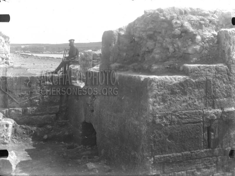 Photo "A worker with saw sitting on the ancient tower near the entrance to the citadel"